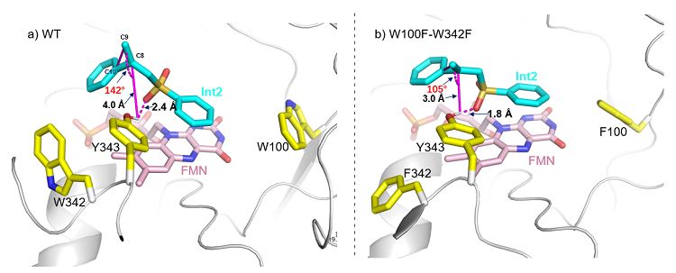 作者使用分子动力学(MD)模拟对反应的对映选择性来源进行了研究(图5)。相比于GluER-WT,在突变体GluER-W100F-W342F的活性位点中,由于侧链尺寸变小,空间排斥力也随之越小,这导致自由基中间体Int2和Y343的活泼氢的距离(3.0 Å)更短,并且发生后续HAT步骤时的二面角(105º)也更合适。此外,自由基中间体Int2与突变体GluER-W100F-W342F的结合能(-34.41 kcal/mol)低于GluER-WT(-32.48 kcal/mol),说明Int2和突变体的结合更加紧密。总的来说,这些数据与所观察到的实验结果是一致的,能够解释产物对映选择性的来源以及突变体GluER-W100F-W342F为什么具有更好的反应性和对映选择性。