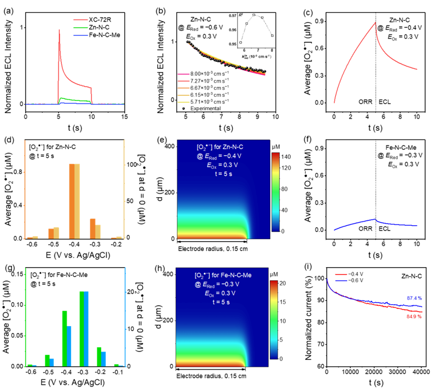 鉴于此,近日东南大学张袁健教授团队提出通过活性氧中间产物的生成建立速率方程,使用超高灵敏的时间依赖ECL(Td-ECL)对碱性介质中的电催化ORR进行动力学评估。发现对ECL强度进行主成分分析,可实现二电子和四电子ORR电催化剂的快速分类。更为重要的是,由于活性氧中间产物和ECL试剂之间存在多种超高灵敏的定量化学反应,通过对ECL衰减曲线进行有限元分析,成功获得了ORR表观速率常数和活性氧中间产物在不同电位下的时间/空间分布等动力学信息。