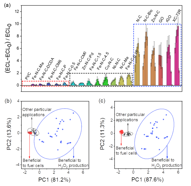 图2. 20种不同电催化剂的ECL强度直方图与主成分分析图