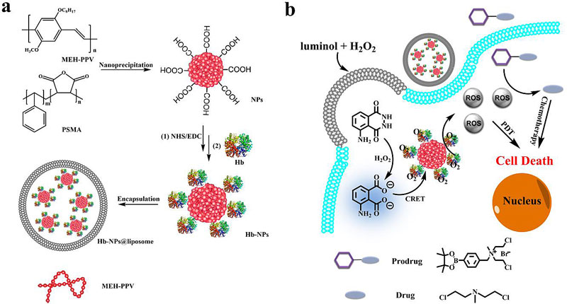 最近,中国科学院化学研究所的王树研究员团队与中国农业大学资源与环境学院的任雪芹教授团队合作,设计了一种能够自发光、自供氧的光动力疗法体系。该体系以共轭聚合物纳米粒子(CNPs)作为主体结构,其表面通过共价连接上血红蛋白(Hb),Hb既作为化学发光体系鲁米诺-过氧化氢的催化剂,又作为氧气的载体。鲁米诺在过氧化氢和Hb存在时发出蓝色化学发光,并将能量转移给CNPs,CNPs被激发从而敏化Hb携带的氧气产生活性氧(ROS),从而达到杀死肿瘤细胞的目的。同时,该体系还可基于前药策略用于抗癌药物氮芥的可控释放以实现化疗的协同治疗。