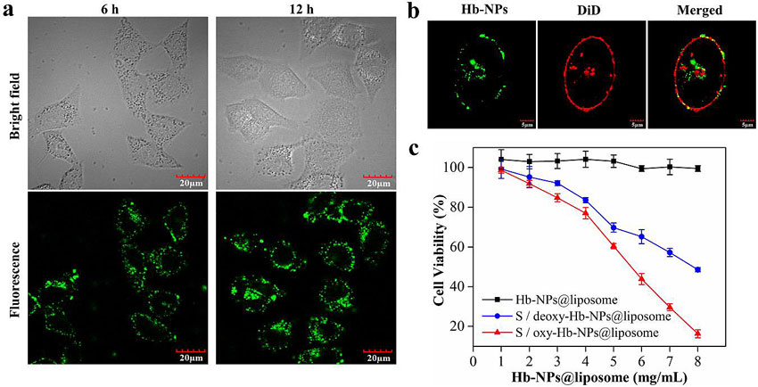 通过对ROS水平的测定,研究人员发现血红蛋白载氧后的oxy-Hb-CNPs体系可更高效的产生ROS,证实Hb携带的氧气在ROS的产生过程中发挥了主要作用。激光扫描共聚焦图表明oxy-Hb-CNPs在与细胞作用6 h后即可进入肿瘤细胞内,并可实现对肿瘤细胞的高效杀伤。以上研究结果表明该自发光、自供氧共轭聚合物纳米粒子体系为肿瘤的高效光治疗提供了一种新思路。