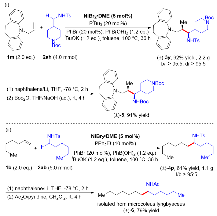 为了展示合成方法的实用性,作者将催化剂用量降至5 mol%并且进行了克级规模的合成(图6)。值得注意的是,即便在这样的条件下,反应的收率和区域选择性也没有显著下降。特别地,4p在脱除保护基和经过乙酰化处理后,可以得到产物6,这种产物是从Microcoleus lyngbyaceus提取的一种天然产物。