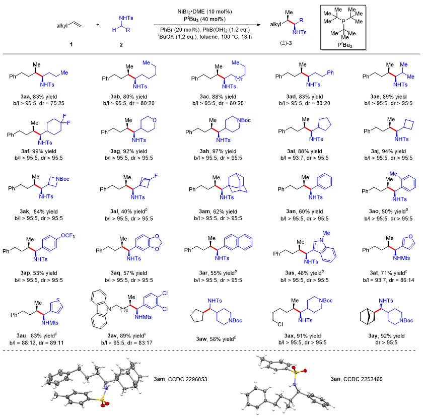 确定最优条件后,作者研究了反应底物的适用范围。选取PtBu3作为最优配体,作者对多种非活化烯烃底物进行了考察。这些底物在氢胺烷基化反应中均展现出了优异的支链区域选择性和syn式非对映选择性,同时获得了良好的收率(图3)。