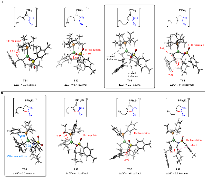 为了深入探究配体调控区域选择性和非对映选择性的原理,作者针对镍催化1a与7b反应中决定区域选择性和非对映选择性的关键步骤—氧化环金属化,进行了密度泛函理论(DFT)计算(图8)。他们发现配体的空间位阻及CH/π弱相互作用对反应的区域选择性和非对映选择性有着显著影响。这些计算结果与实验数据相一致。