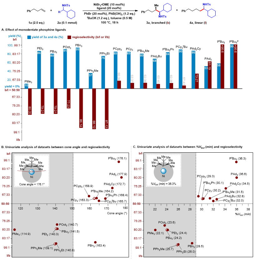 作者选取烯烃1a和磺酰胺2a作为模版底物,优化反应条件。经过系统的优化,作者发现使用PtBu3作为配体时,能以99%的收率获得以支链为主的产物(b/l > 95:5)。换用体积较小的配体后,经系统筛选,发现使用PPh2Et作为配体时,能以76%的收率获得以直链为主的产物(l/b = 87:13)(图2)。随后,作者深入研究了反应区域选择性与配体结构的关系。借助Gensch等人近期开发的名为“Kraken”的膦配体描述符库,该库提供了数千种单膦配体的多种描述符。通过分析,作者发现反应的区域选择性与两个配体空间描述符——锥角(图2B)和最小埋藏体积百分比%Vbur(min)(图2C)相关。通过对数十种的膦配体数据集分析,作者确定了两个与反应区域选择性相关的阈值:配体锥角约为150°,最小埋藏体积百分比%Vbur(min)约为29%。虽然锥角参数未能完全区分两类配体,但最小埋藏体积百分比%Vbur(min)成功区分了支链选择性与直链选择性的不同配体。最小埋藏体积百分比%Vbur(min)大于29%的配体倾向于支链选择性,而小于29%的配体则表现出直链选择性。
