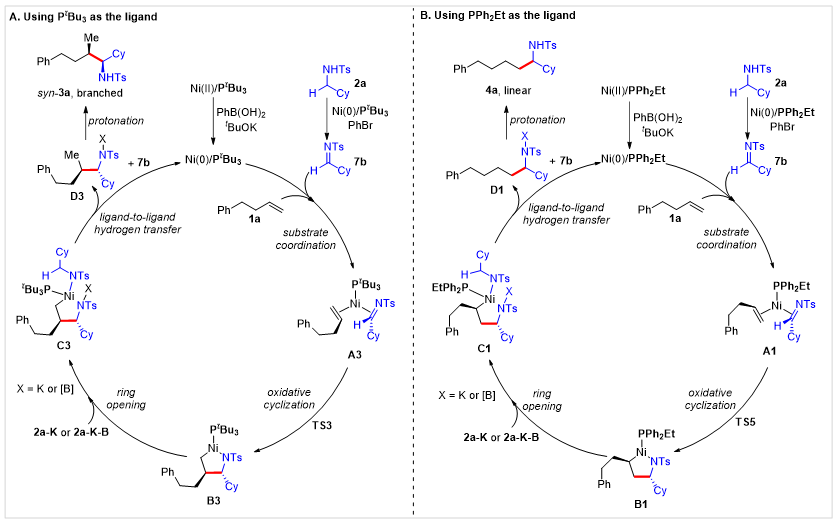 基于机理实验和DFT计算结果,作者建议了可能的反应机理。使用配体PtBu3时,反应经由中间体A3,通过过渡态TS3,形成镍杂五元环中间体B3,进而生成具有支链区域选择性和syn式非对映选择性的产物syn-3a(图9A)。另一方面,当使用配体PPh2Et时,反应则是通过中间体A1和过渡态TS5生成中间体B1,从而促使生成具有直链区域选择性的产物4a(图9B)。这样不同的配体选择引导反应沿着不同的路径进行,从而实现了对产物区域选择性和非对映选择性的精准控制。