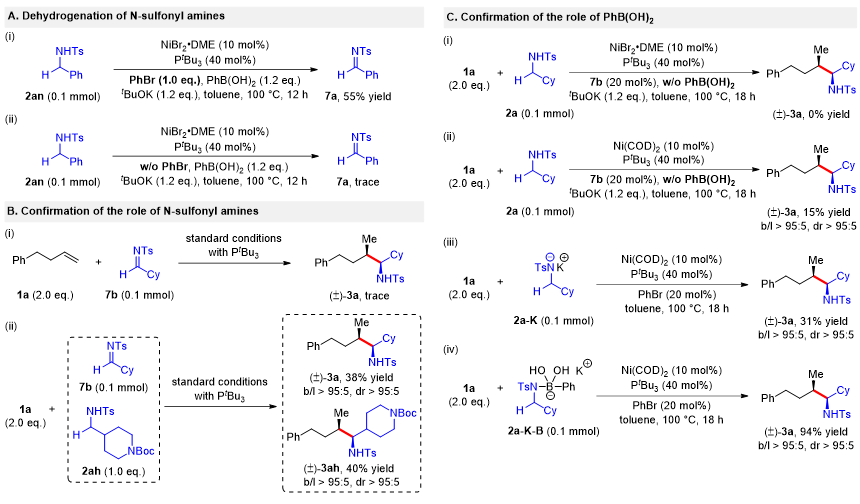 通过机理实验,作者研究了反应中各组分的作用机理(图7)。研究发现,添加适量的溴苯能够促进磺酰胺向磺酰亚胺的转换;底物磺酰胺作为亚胺前体和氢源;苯硼酸作为添加剂具有双重作用:一方面,它能将二价镍催化剂还原为更活性的零价镍催化剂,另一方面,它可能促进了关键中间体的开环反应。值得注意的是,实验中发现,加入苯硼酸能显著增加关键成分磺酰胺钾盐在甲苯中的溶解度,这可能是促进反应高效进行的一个关键因素。