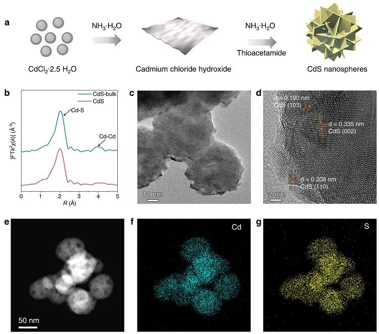 图2. CdS和CdS-bulk的结构和形貌表征。(a) CdS合成过程示意图。(b) R空间中CdS和CdS-bulk的k2加权Cd K边傅立叶变换EXAFS光谱。(c-d) TEM和HRTEM图像以及(e-g) HAADF-STEM图像和CdS相应的Cd和S元素扫描。