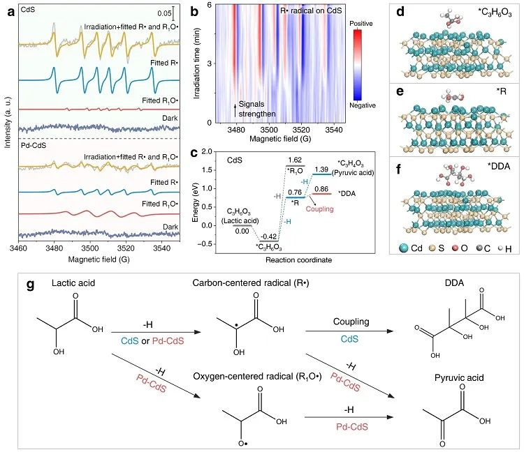 图4. 水热预处理的PLA溶液在Pd-CdS和单独CdS上光重整的反应机制。(a) 在黑暗或光照条件下(灰线,可见光照射6 min)CdS和Pd-CdS上检测到的EPR信号,以及R•自由基、R1O•自由基及其组合的拟合EPR信号(R•和R1O•自由基,黄线)。(b) CdS上照射0 min到6 min的EPR信号的二维图。(c) DFT计算CdS上的乳酸在不同反应过程的能量分布。CdS 表面吸附(d) 乳酸、(e) R和(f) 偶联产物(DDA,2,3-二羟基-2,3-二甲基琥珀酸)的优化模型。(g) 不同光催化剂(CdS和Pd-CdS)的反应路径。