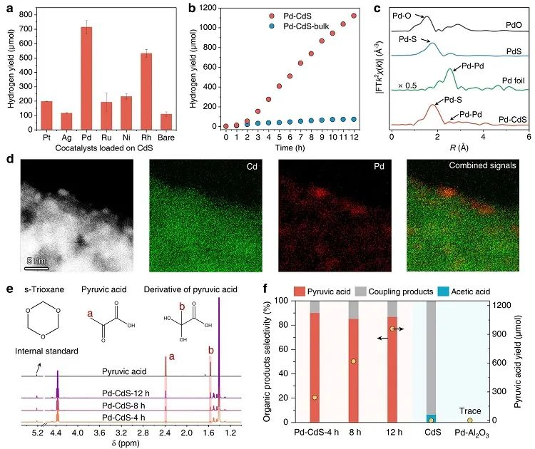 图3. 水热预处理PLA溶液在可见光照射下的光重整。(a) 预处理的PLA溶液在不同金属负载的CdS上反应8 h后光重整产氢。(b) Pd-CdS和Pd-CdS-bulk随时间的氢气产生。(c) PdO、PdS、Pd foil和Pd-CdS在R空间中的k2加权Pd K边傅里叶变换 EXAFS光谱。(d) 球差校正的HAADF-STEM图像和相应的Cd、Pd和组合形式的元素扫描。(e) 丙酮酸标样和Pd-CdS催化光重整4 h、8 h和12 h小时后稀释液的1H NMR谱。s-Trioxane(三噁烷)用作内标。(f) 在Pd-CdS(4 h、8 h、12 h)、CdS(8 h)和Pd-Al2O3(8 h)光重整反应后,有机产物选择性和丙酮酸产率。