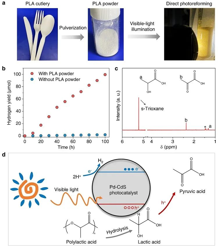 图5. Pd-CdS对真实PLA塑料的直接光重整。(a) PLA餐具、相应粉碎粉末和光催化反应器的照片。(b) Pd-CdS上100 h的PLA的光重整和控制实验。(c) PLA 粉末光重整100 h后稀释液的1H NMR谱。*信号可能属于PLA餐具的添加剂。s-Trioxane(三噁烷)用作内标。(d) PLA在Pd-CdS上的直接光重整过程示意图。