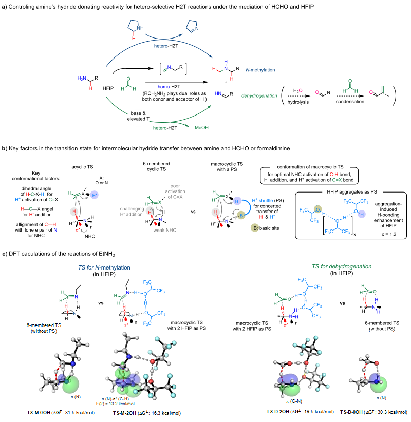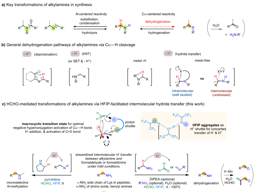 近日,陈弓课题组开发了甲醛-六氟异丙醇搭配的新“魔术”,成功激发烷基胺α C-H键的氢负释放潜力,使得烷基胺在温和条件下的分子间氢负转移反应成为可能(图1c)。作者以吡咯烷作为外部氢负离子供体,烷基伯胺在室温下通过醛亚胺中间体(氢负离子受体)进行选择性N-甲基化反应;将反应条件调整为中性或弱碱性,烷基伯胺(氢负离子供体)可以通过氢负离子直接转移到HCHO(氢负离子受体)进行选择性脱氢,生成亚胺并进一步转化为其它羰基产物。机理研究表明,HFIP溶剂介导的大环过渡态可以通过负超共轭作用并采用最佳构象激活胺的α C-H键。