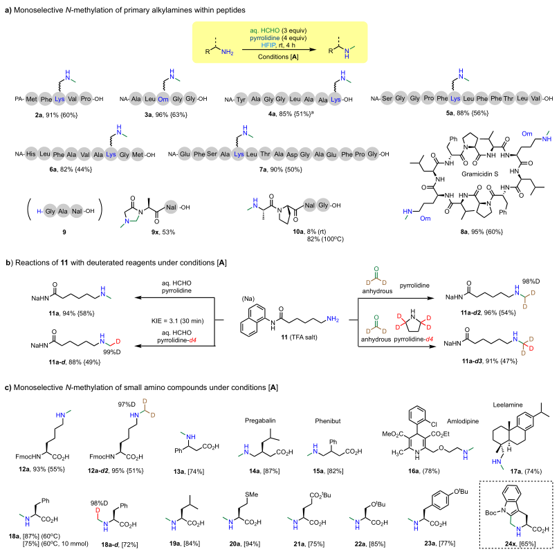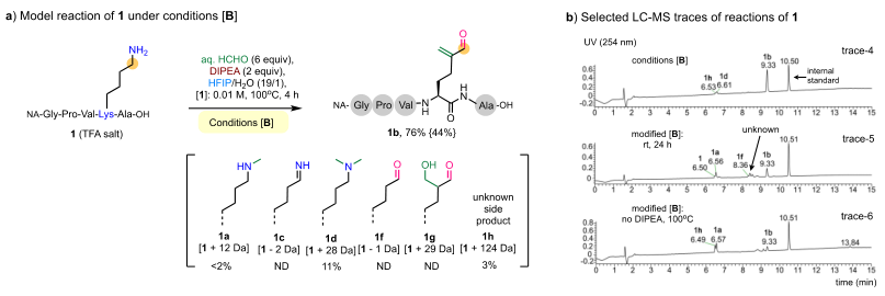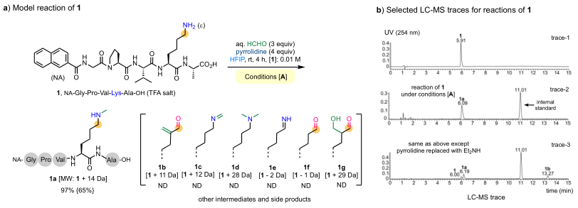基于赖氨酸氨基侧链独特的负氢性(hydricity),作者引入环状仲烷基胺(吡咯烷,4当量)作为氢负供体,HFIP作为溶剂,并在室温下与肽底物1,aq. HCHO(3当量)反应4小时后,以高效率、高选择性得到N-甲基化产物1a(条件[A],见图2b中的LC-trace-2)。