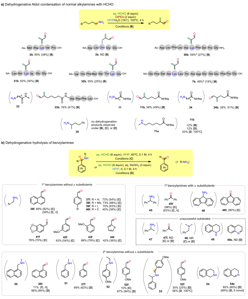 如图5a所示,赖氨酸的脱氢反应对多种肽底物都有效。原则上,C反应位点受阻的烷基胺的脱氢反应可以在亚胺或醛阶段停止。如图5b所示,作者发现苄胺可以与HCHO反应生成苯甲醛,而且收率很高。该脱氢水解反应对多种苄基伯胺(37f-39f,41f-43f)具有良好的反应效果。具有缺电子取代基的苄胺的反应活性较低(见40f)。以底物50为例,仲苄基烷基胺在条件[C]下通常不能很好地发挥作用。但是,烷基胺添加剂的加入可以显著提高反应效率。在所研究的烷基胺中,加入3当量的aq. MeNH2的效果最好。作者推测,MeNH2和HCHO反应生成的醛亚胺中间体是比HCHO更好的氢负受体,更有利于接受氢负离子,提高反应活性。