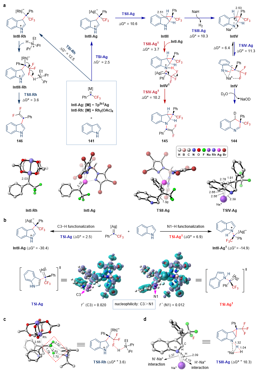 为了探索催化剂对反应路径的催化机制,作者分别比较了Rh和Ag催化生成144、145和146的反应路径。结果表明,Rh和Ag催化剂均可以催化反应体系生成三类产物。C3位偕二氟烯基化过程和C2,C3位环丙烷化过程取决于碱的种类。当NaH为碱时,Rh和Ag均可催化生成产物144和145,反应选择性取决于N-邻三氟甲基苯磺酰腙和吲哚的比例。当碱为DIPEA时,Rh催化时形成产物146和145分决速步骤差(ΔΔG≠ = 7.4 kcal mol–1),比Ag催化体系(ΔΔG≠ = 2.3 kcal mol–1)大,这决定了在C3位偕二氟烯基化反应中,Rh催化比Ag催化具有更高的选择性。这与实验观察到的结果保持一致。