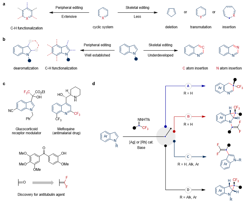 吲哚是活性药物分子和天然产物中最常见的含氮杂环之一,被视为后期骨架编辑的理想底物。含氟片段的引入能够明显改善含吲哚或喹啉药物分子的生理活性(如已上市的抗疟疾药物- Mefloquine,图1c)。尽管关于吲哚分子编辑的研究已经取得了巨大的进展,但目前已报道的外围编辑和骨架编辑通常依赖于不同的反应策略和起始材料,仍具有一定的局限性。