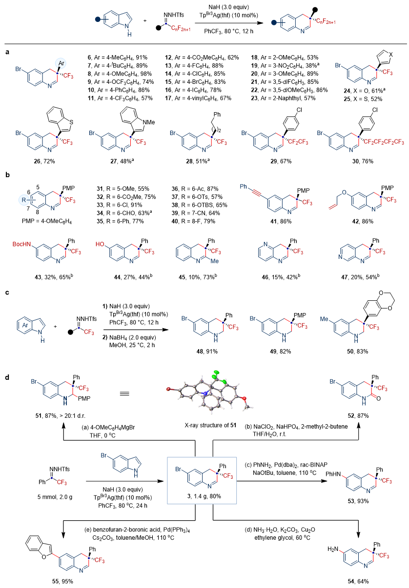 银催化的氟烷基卡宾对吲哚的一碳插入反应具有宽泛的底物适用范围和良好的官能团耐受性。各种拉电子基、给电子基以及杂芳环取代N-邻三氟甲基苯磺酰基腙和吲哚均可以良好至优异的产率得到一碳插入产物。其中,全氟烷基链的引入以及4-氮杂吲哚和6-氮杂吲哚的成功转化,将对新药研发起到促进作用。为了验证该方法的高效性和实用性,作者进行了一锅两步反应、克级规模实验以及系列衍生化实验,成功得到了四氢喹啉、3,4-二氢喹啉-2(1H)-酮等产物。
