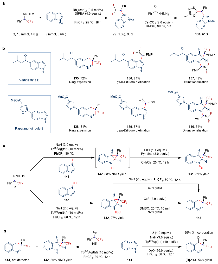 紧接着,作者对吲哚C3位偕二氟烯基化反应的底物范围进行了考察。如图3a所示,无论是N-未保护吲哚还是N-保护吲哚,一系列具有各种功能手柄的N-邻三氟甲基苯磺酰基腙均能够实现反应的高效转化。吡咯C2位偕二氟烯基化产物的生成,进一步展示出了该方法的普适性,这在先前报道的文献中是难以实现的。此外,双官能化反应也显示出了较好的官能团耐受性。对于N-保护吲哚而言,除了C3位的协二氟烯基化反应,同样可以实现C2,C3位的去芳构化环丙烷化反应。如图3c所示,无论是变换吲哚上的取代基,还是更替N-邻三氟甲基苯磺酰基腙上的取代基,甚至是吲哚N原子上的保护基,如苄基、芳基、特戊酰基(Piv)、氨基甲酰基(CONMe2)、叔丁基二甲基甲硅烷基(TBS)等官能化基团均可以兼容到该反应体系当中。