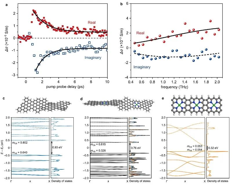 为了研究PGNRb的电荷本征传输特性,作者采用非接触式超快太赫兹光谱对其进行测量。首先,使用400 nm光脉冲将价带中的电子激发到导带产生光生载流子,然后使用太赫兹脉冲探测光生载流子的超快动力学和传输过程。通过测量太赫兹光电导频域谱,并进行理论模型拟合,可得到载流子散射时间。结果显示PGNRb中光生载流子具有长约54 fs的散射时间,本征迁移率达450 cm2 V−1 s−1。考虑到纳米带的形貌特性,直流极限下的迁移率约为32 cm2 V−1 s−1。理论计算表明,PGNR具有比纯碳GNR更高的能带色散和更小的载流子有效质量,因而具有高迁移率。相比之下,卟啉纳米带由于结构平整,具有最高的能带色散和最小的载流子有效质量,以及最高的载流子迁移率。