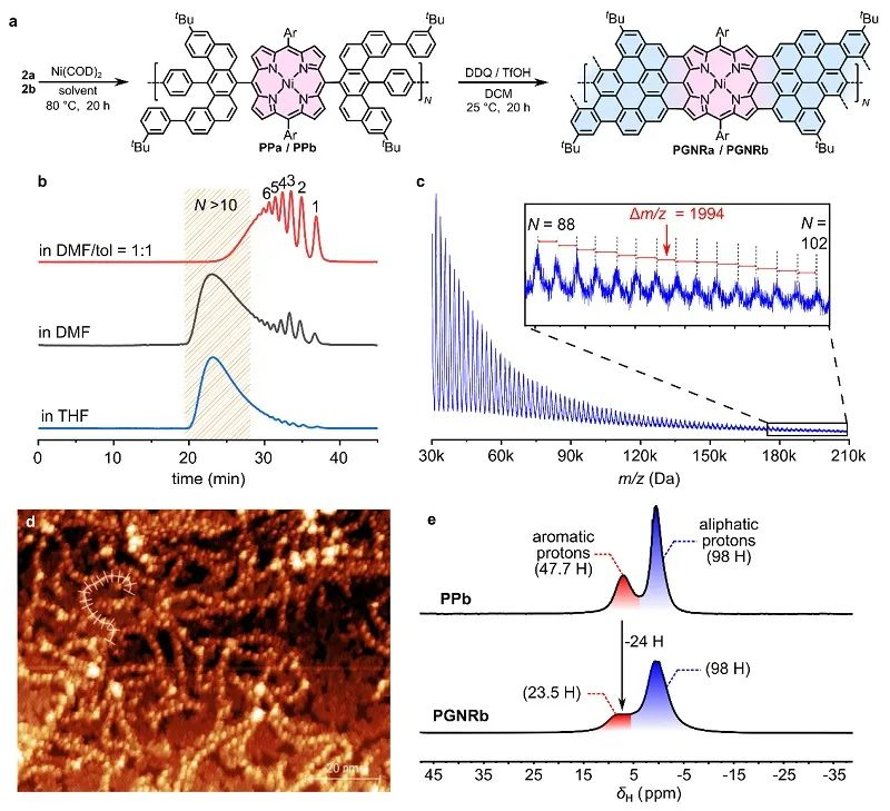 图4. 卟啉稠合石墨烯纳米带的合成与结构表征。a)合成路线;b)PPb的GPC分析;c)PPb的MALDI-TOF质谱;d)PPa的STM谱;e)固态核磁共振氢谱。