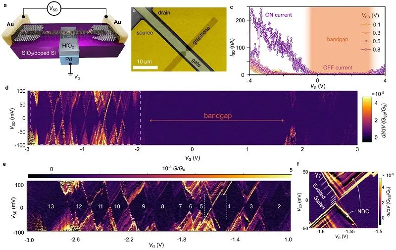 图6. 单分子晶体管及单电子传输性质。a)器件结构示意图;b)典型器件的扫描电子显微镜图像;c)单分子晶体管在室温下的特性曲线;d)PGNRb单分子器件的稳定性图;e)库仑阻塞区的放大图;f)图e中白色方框内的放大图。