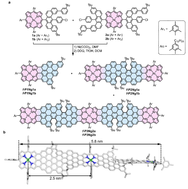 图2. 模型化合物-卟啉稠合纳米石墨烯寡聚物-的合成及三聚体的分子模型。