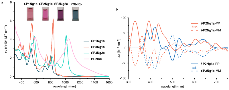 随着分子尺寸增大,f-P1Ng1a、f-P2Ng1a和f-P3Ng2a的吸收波长逐渐红移(图3a)。f-P2Ng1a相对于f-P1Ng1a红移表明两个卟啉单元之间具有强电子共轭作用,f-P3Ng2a的红移比f-P2Ng1a更显著,归因于卟啉单元个数增加扩展了中间卟啉的π共轭体系。由于fjord边缘具有手性,f-P2Ng1a存在两种在室温下无法相互转化的对映异构体。经手性拆分得到两个组分(f-P2Ng1a-MM和f-P2Ng1a-PP),其圆二色谱呈镜像对称,与理论模拟结果一致(图3b),其中f-P2Ng1a-PP的不对称因子为0.0013(604 nm)和0.00056(695 nm)。